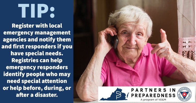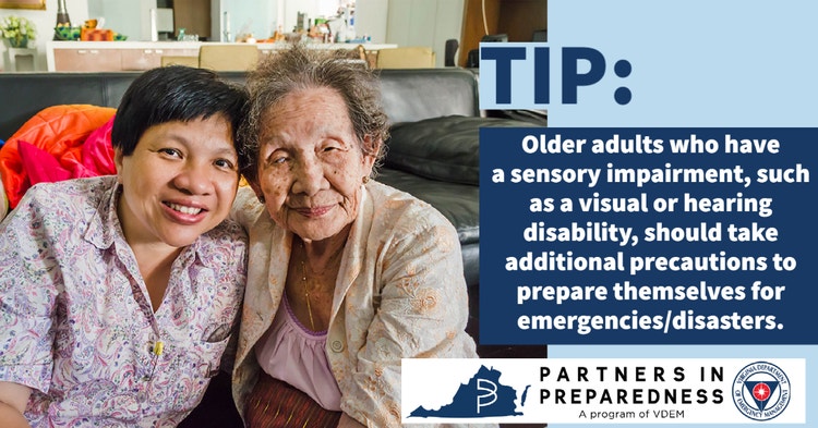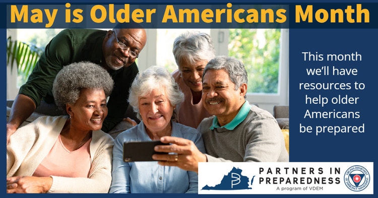 May is Older Americans Month. It was established in 1963 when President John F. Kennedy and members of the National Council of Senior Citizens wanted to acknowledge the contributions of past and current older persons to our country, in particular those who defended our country. VDEM will be celebrating older Americans by sending out important preparedness tips that might be helpful to seniors.